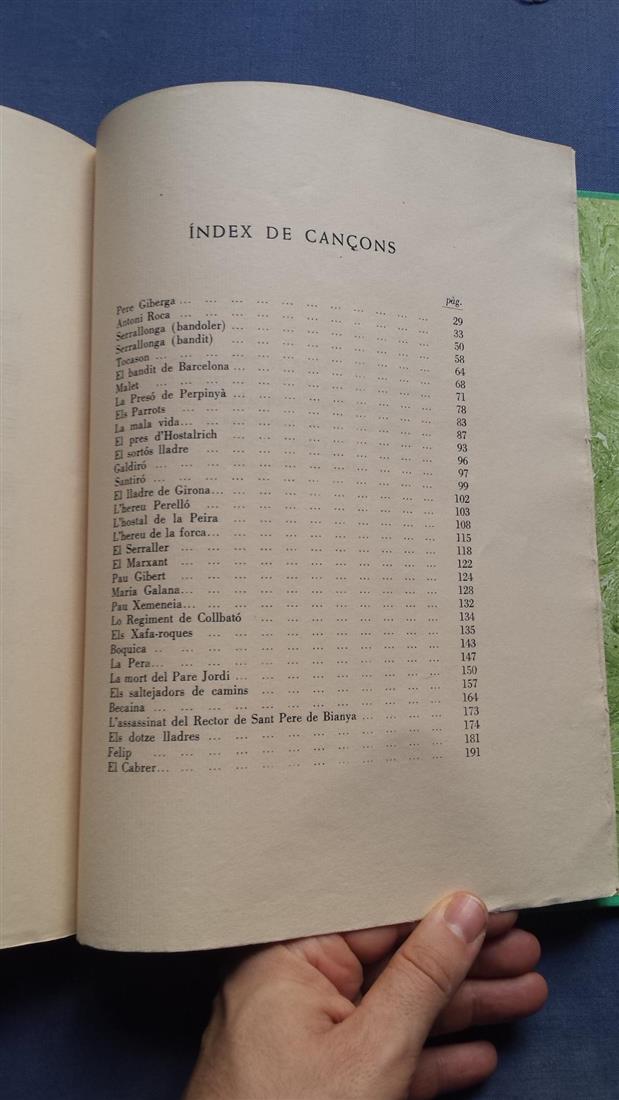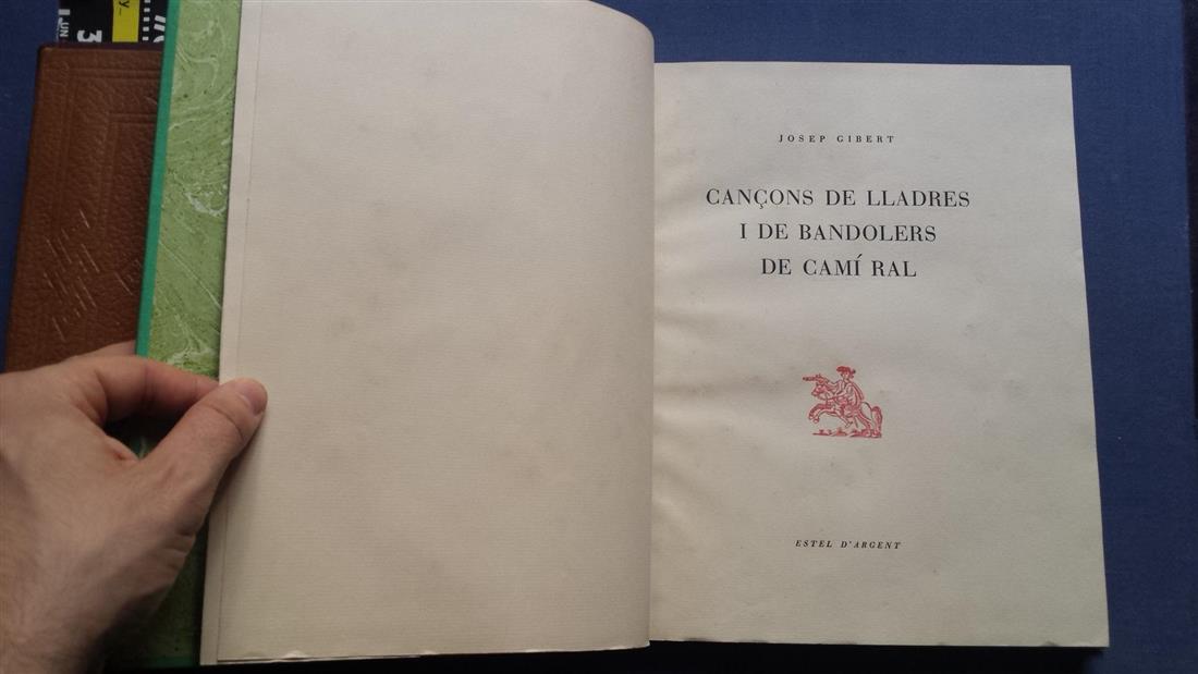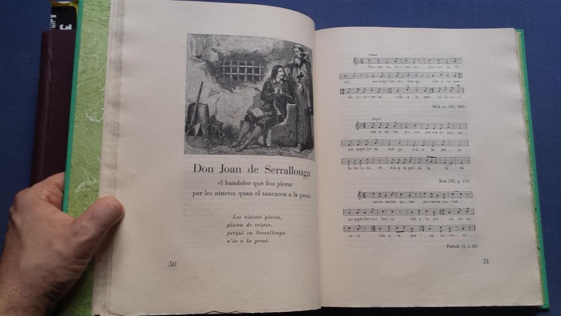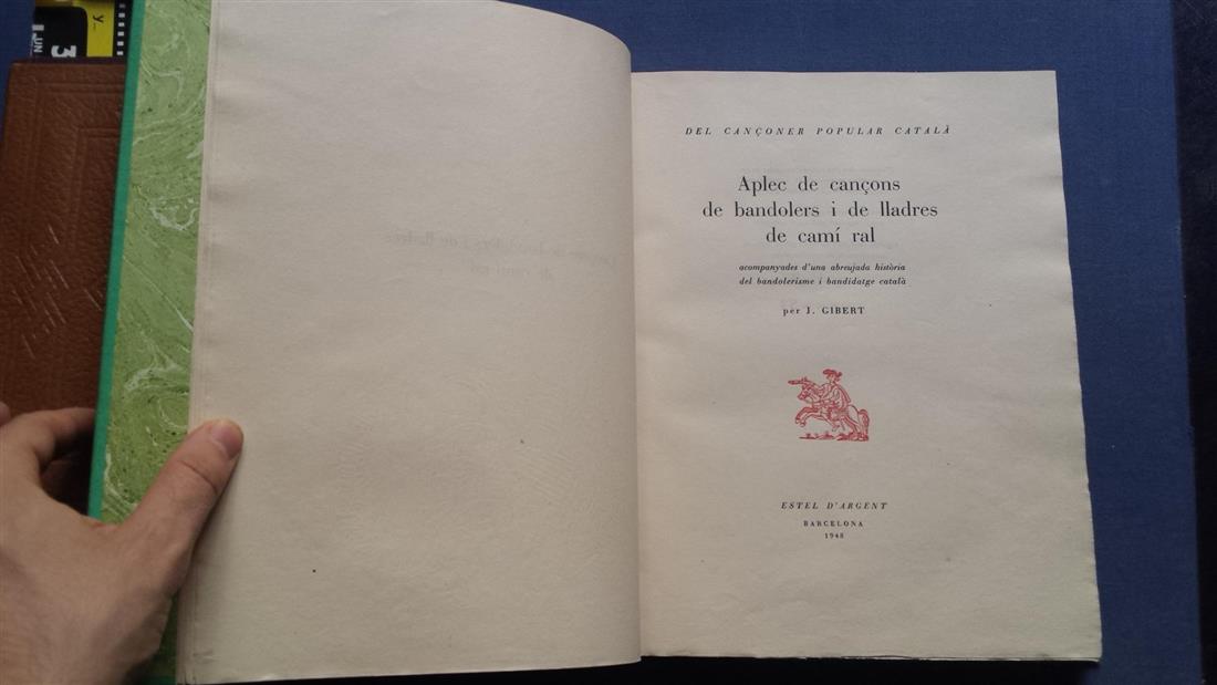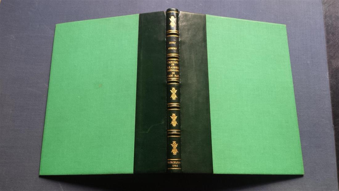 Autor: J. Gibert ------------------------------------------------------------------- Título: Aplec de cançons de bandolers i de lladres de camí ral, acompanyades d'una abreujada història del bandolerisme i bandidatge català ------------------------------------------------------------------- Lugar y Fecha de Publicación: Barcelona, Estel d'Argent, 1948 ------------------------------------------------------------------- Páginas: 197, (5) ------------------------------------------------------------------- Dimensiones: cm. 28,3x22 ------------------------------------------------------------------- Estado de conservación: Algunas pequeñas manchas y puntos de oxido, pero generalmente todo de veras en buen estado, ver fotos ------------------------------------------------------------------- Descripción: Encuadernación holandesa en piel y tela, lomo con letras y decoraciones doradas, nervios, preciosa. Edición numerada, exemplar núm. 53 de 244. Ver título y Fotos ------------------------------------------------------------------- Encuadernación preciosa, Bandolerismo Catalán, Música, Del Cançoner Popular Catalá |
