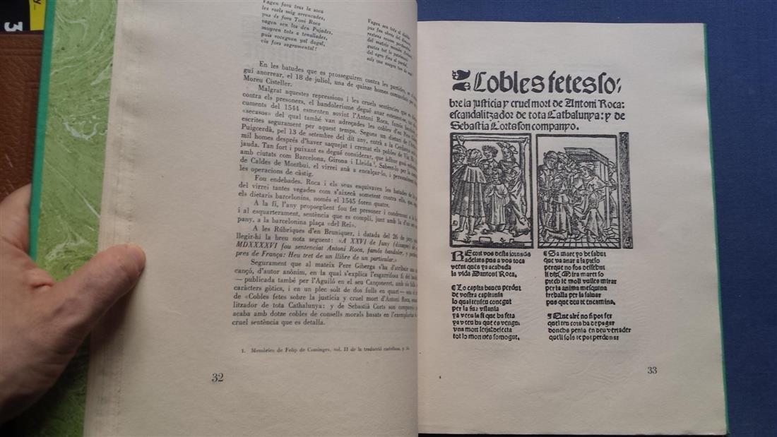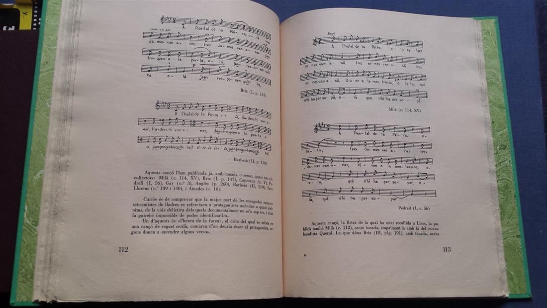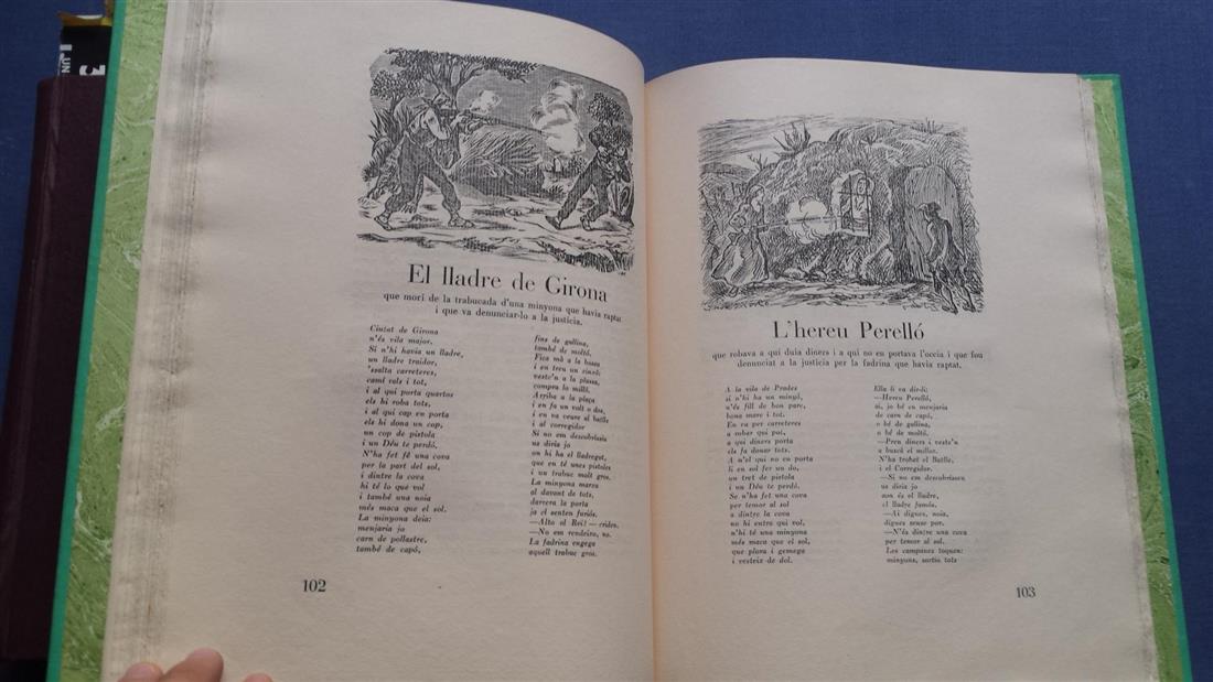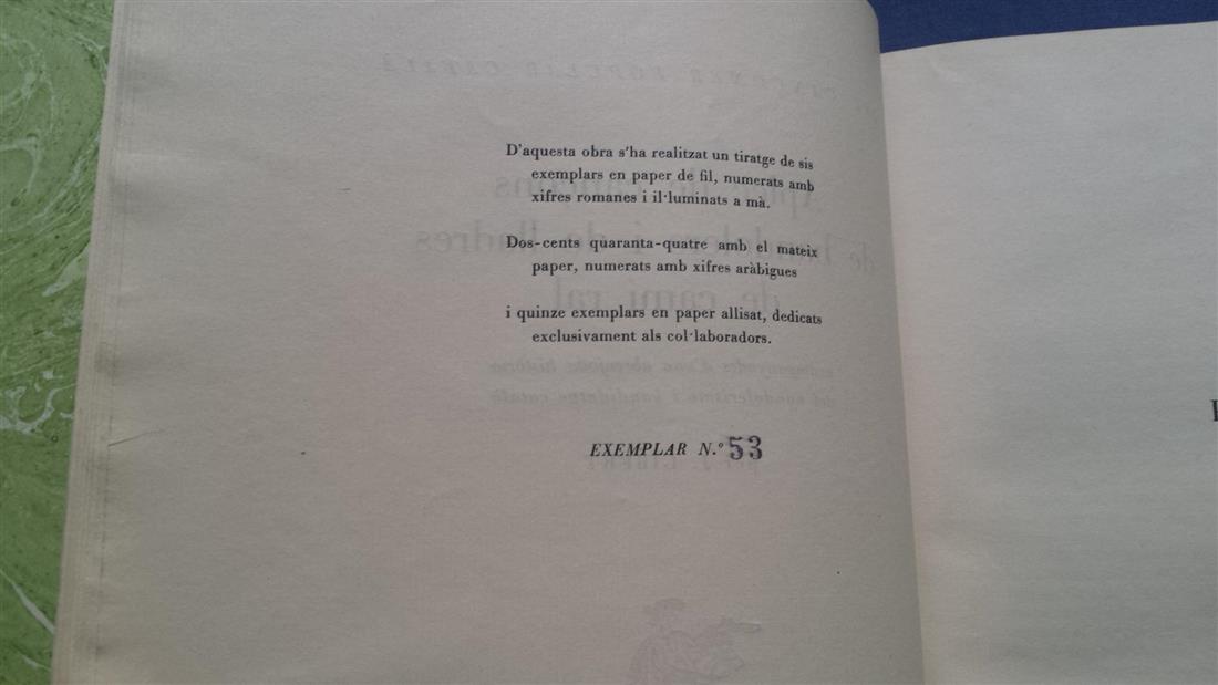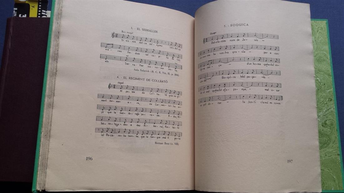 Autor: J. Gibert ------------------------------------------------------------------- Título: Aplec de cançons de bandolers i de lladres de camí ral, acompanyades d'una abreujada història del bandolerisme i bandidatge català ------------------------------------------------------------------- Lugar y Fecha de Publicación: Barcelona, Estel d'Argent, 1948 ------------------------------------------------------------------- Páginas: 197, (5) ------------------------------------------------------------------- Dimensiones: cm. 28,3x22 ------------------------------------------------------------------- Estado de conservación: Algunas pequeñas manchas y puntos de oxido, pero generalmente todo de veras en buen estado, ver fotos ------------------------------------------------------------------- Descripción: Encuadernación holandesa en piel y tela, lomo con letras y decoraciones doradas, nervios, preciosa. Edición numerada, exemplar núm. 53 de 244. Ver título y Fotos ------------------------------------------------------------------- Encuadernación preciosa, Bandolerismo Catalán, Música, Del Cançoner Popular Catalá |